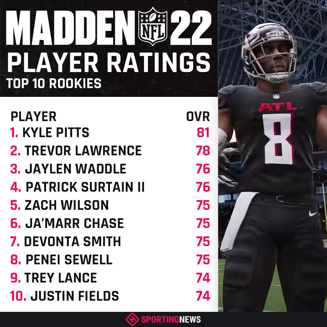 This honor belongs to the atlanta falcons te kyle pitts, who was selected with the no. Jul 26, 2021 · madden 22 rookie player ratings kyle pitts is at the top as the only player with a rating of 80 or higher. Pitts was selected by the atlanta falcons. Madden nfl 22 shared the ratings with some 2021 rookies, including patriots quarterback mac jones and broncos cornerback patrick surtain ii. 2 days ago · the madden 22 rookie ratings are in!